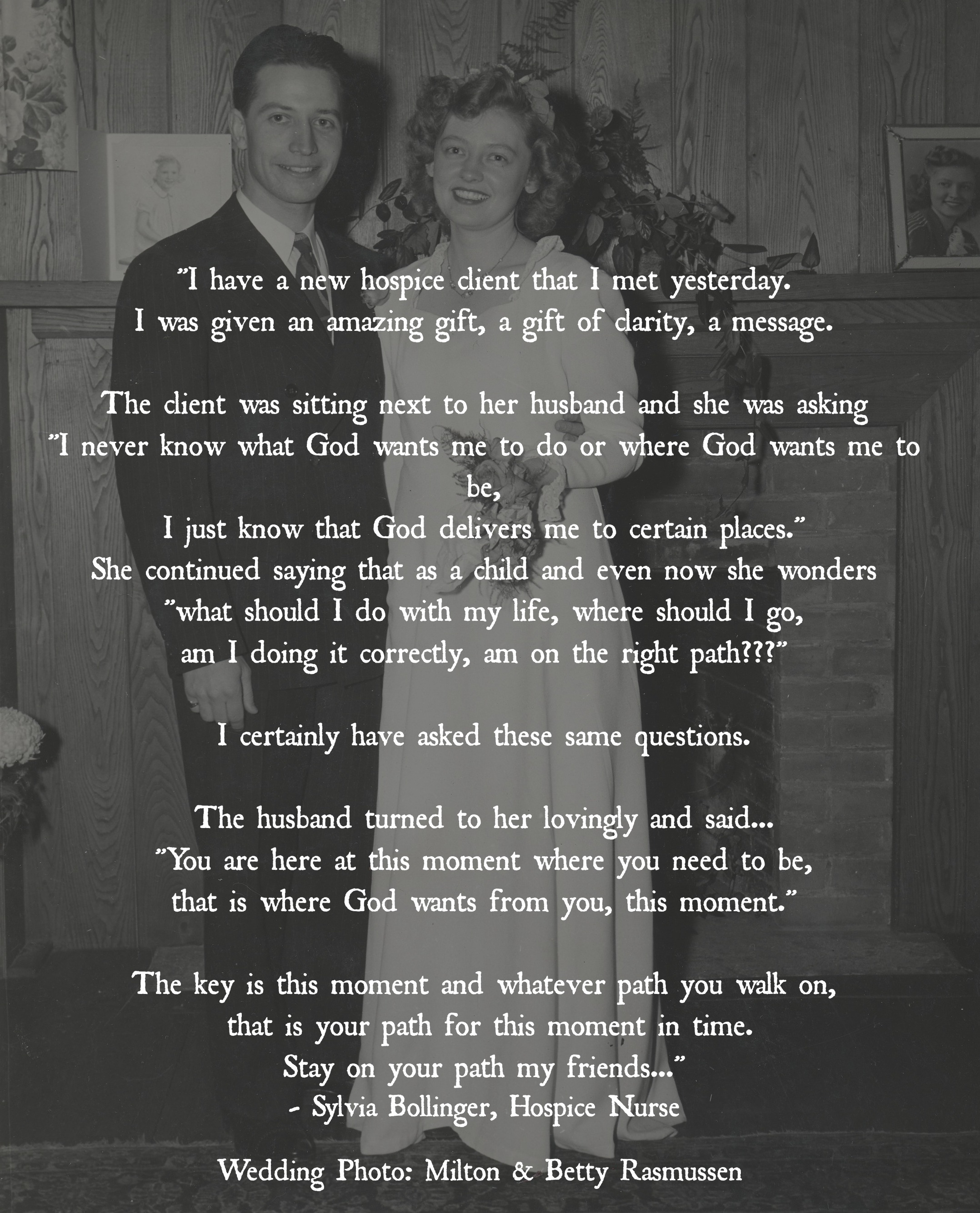 The key is this moment and whatever path you walk on, that is your path for this moment in time. Stay on your path my friends. – Sylvia Bollinger, Hospice Nurse
